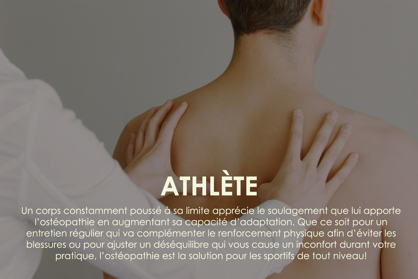 L’ostéopathie est une thérapie manuelle qui voit le corps en sa globalité et qui cherche la source du problème. Le concept d’auto-régulation du corps est très important, puisque l’ostéopathe ne va pas guérir, mais va plutôt être l’intermédiaire qui, par l’entremise de diverses techniques, va permettre au corps de retrouver son homéostasie.
